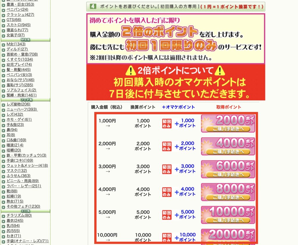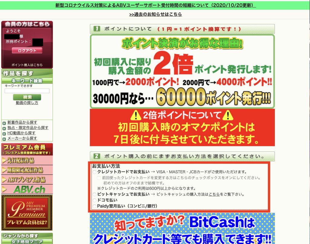 ポイントで購入しなくても動画はクレジットカード等で直接購入できますが、基本的にはポイントを購入してからの方がオマケポイントが付くためお得になります。