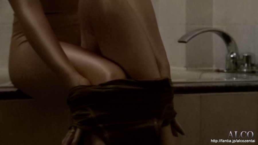 肌色に近いゴールドタイツを着用したモデル女性が、水着を着用しながら、一人シャワーを浴びます。