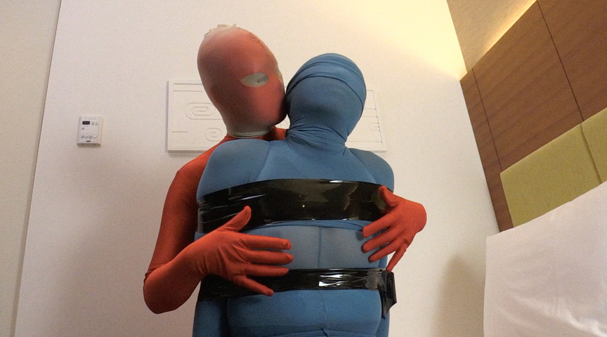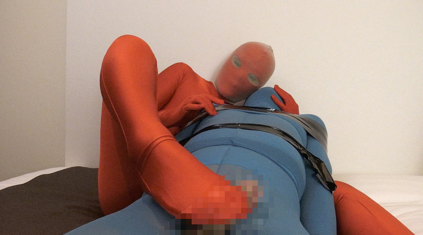 青色の全身タイツ男が、赤の全身タイツ痴女に責められます。